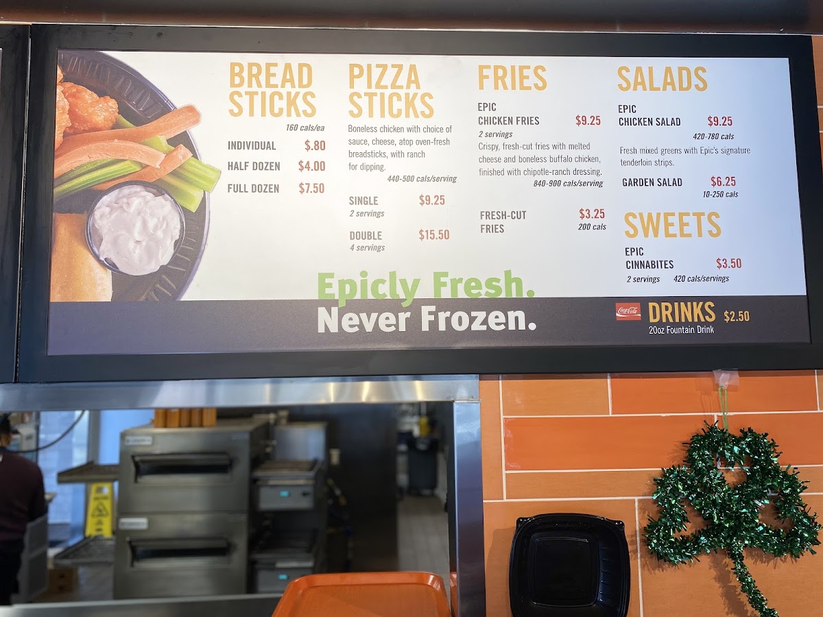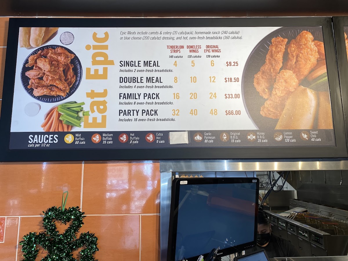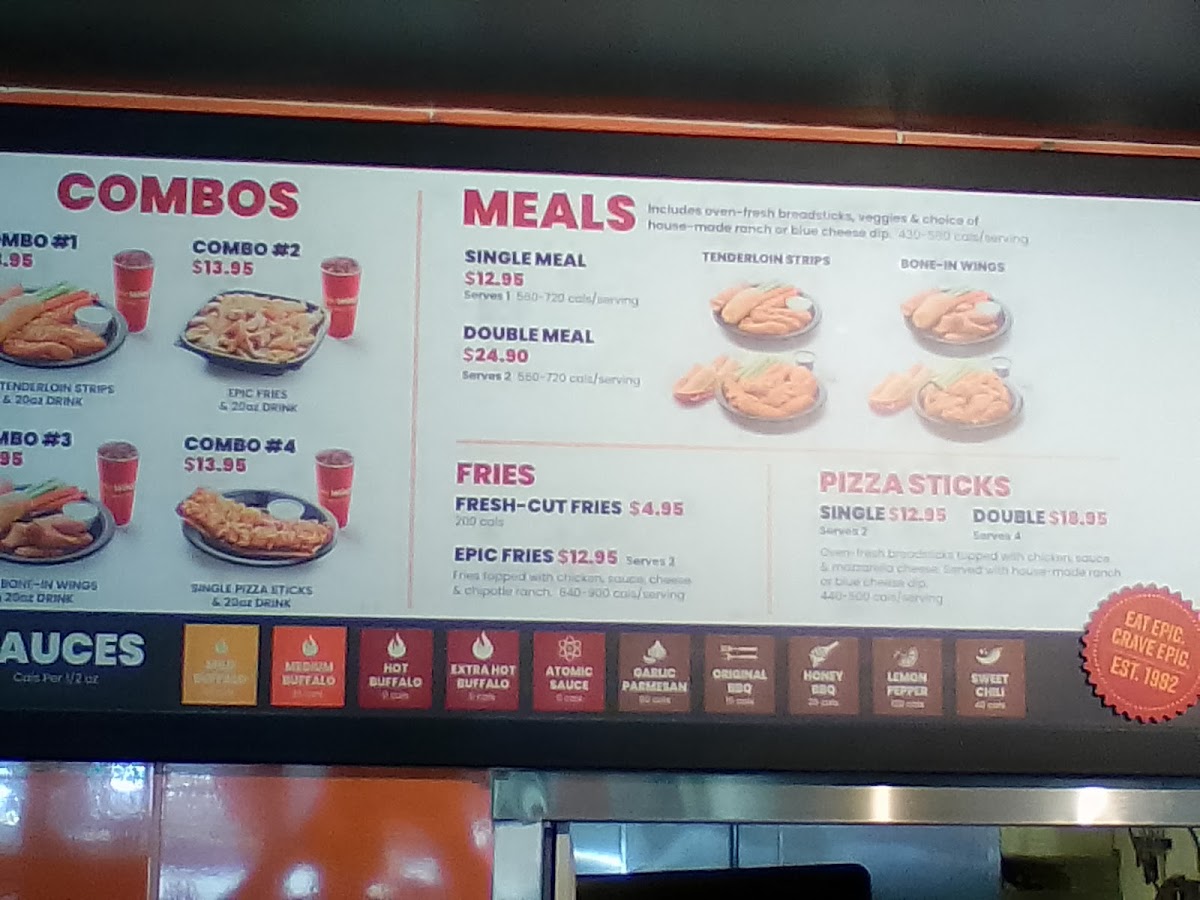 Epic Wings offers a diverse and flavorful menu that caters to a variety of cravings. For those seeking value, the $10 Daily Deals are a standout, featuring options like the 3 pc Tenderloin Strips Combo Meal, Epic Chicken Fries Combo Meal, and 5 pc Chicken Wings Combo Meal. For a heartier meal, the Epic Combo Meals present similar choices, including the Epic Chicken Rice Bowl Combo. Their Single Meals such as the 4 pc Tenderloin Strips Meal and 6 pc Chicken Wings Meal offer satisfying portions, while the Double Meals with 8 pc Tenderloin Strips Meal and 12 pc Chicken Wings Meal are perfect for those with bigger appetites. For families, the Family Meals provide great value, with options like Family 16 pc Tenderloin Strips and Family 24 pc Chicken Wings. If you're feeding a crowd, the Party Packs, like the Party 32 pc Tenderloin Strips and Party 48 pc Chicken Wings, are ideal. Sides like Epic Chicken Fries, Fresh Cut Fries, and Pizza Sticks (available in Single or Double) complement the meals, while drinks like 20oz Fountain Drink or a Red Bull Energy Drink refresh. If you're in the mood for something sweet, don't miss the Cinnabites for dessert. Additionally, the Chicken Wings A La Carte and Tenderloin Strips A La Carte offer flexibility, allowing you to choose the perfect number of pieces, from 6 pc Chicken Wings to 48 pc Chicken Wings or 32 pc Tenderloin Strips. With such a broad selection, Epic Wings is a go-to spot for anyone craving quality comfort food.