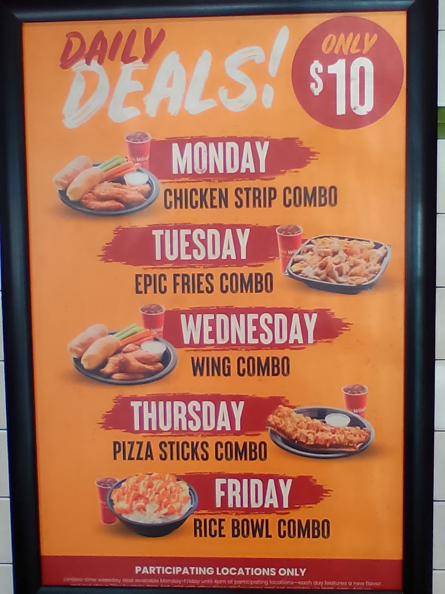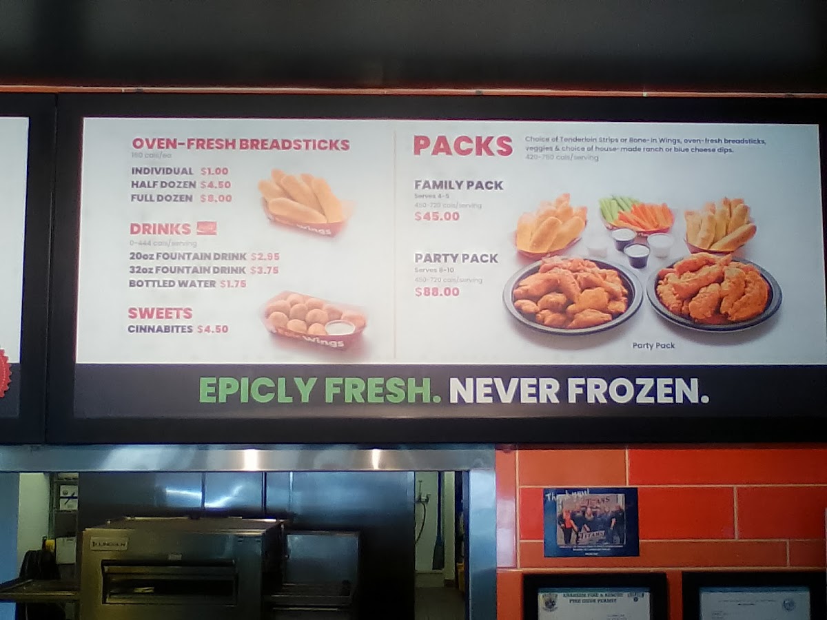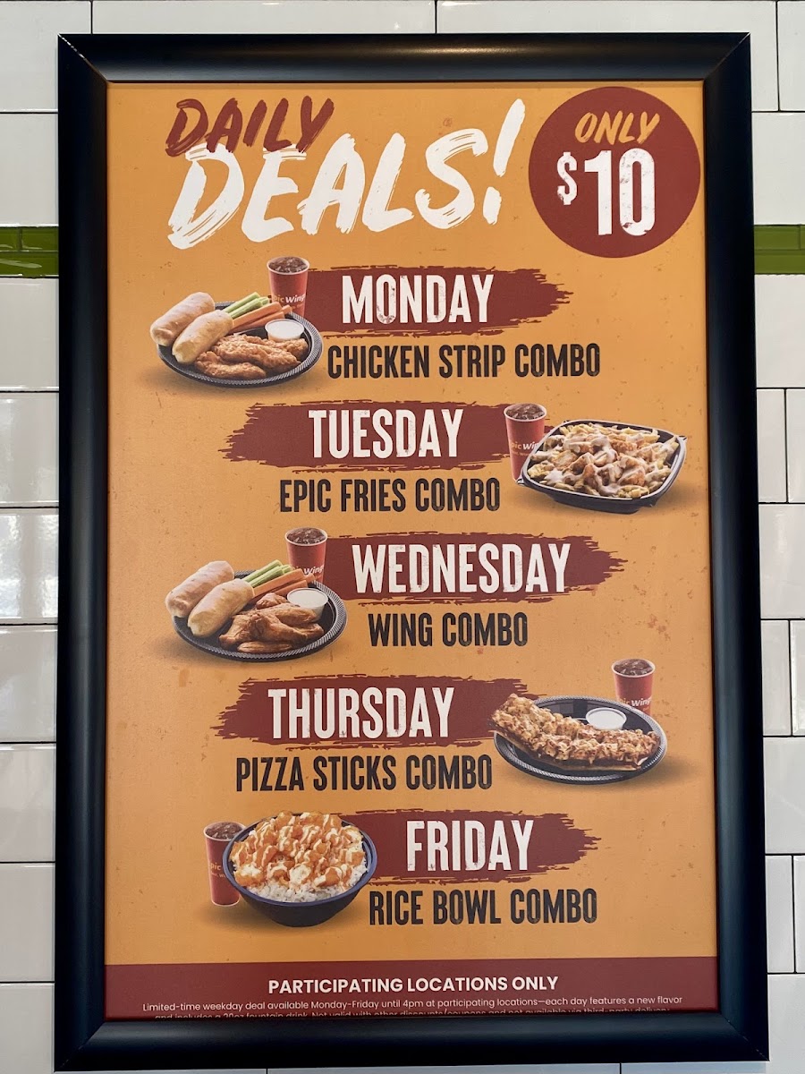Epic Wings offers a diverse and flavorful menu that caters to a variety of cravings. For those seeking value, the $10 Daily Deals are a standout, featuring options like the 3 pc Tenderloin Strips Combo Meal, Epic Chicken Fries Combo Meal, and 5 pc Chicken Wings Combo Meal. For a heartier meal, the Epic Combo Meals present similar choices, including the Epic Chicken Rice Bowl Combo. Their Single Meals such as the 4 pc Tenderloin Strips Meal and 6 pc Chicken Wings Meal offer satisfying portions, while the Double Meals with 8 pc Tenderloin Strips Meal and 12 pc Chicken Wings Meal are perfect for those with bigger appetites. For families, the Family Meals provide great value, with options like Family 16 pc Tenderloin Strips and Family 24 pc Chicken Wings. If you're feeding a crowd, the Party Packs, like the Party 32 pc Tenderloin Strips and Party 48 pc Chicken Wings, are ideal. Sides like Epic Chicken Fries, Fresh Cut Fries, and Pizza Sticks (available in Single or Double) complement the meals, while drinks like 20oz Fountain Drink or a Red Bull Energy Drink refresh. If you're in the mood for something sweet, don't miss the Cinnabites for dessert. Additionally, the Chicken Wings A La Carte and Tenderloin Strips A La Carte offer flexibility, allowing you to choose the perfect number of pieces, from 6 pc Chicken Wings to 48 pc Chicken Wings or 32 pc Tenderloin Strips. With such a broad selection, Epic Wings is a go-to spot for anyone craving quality comfort food.